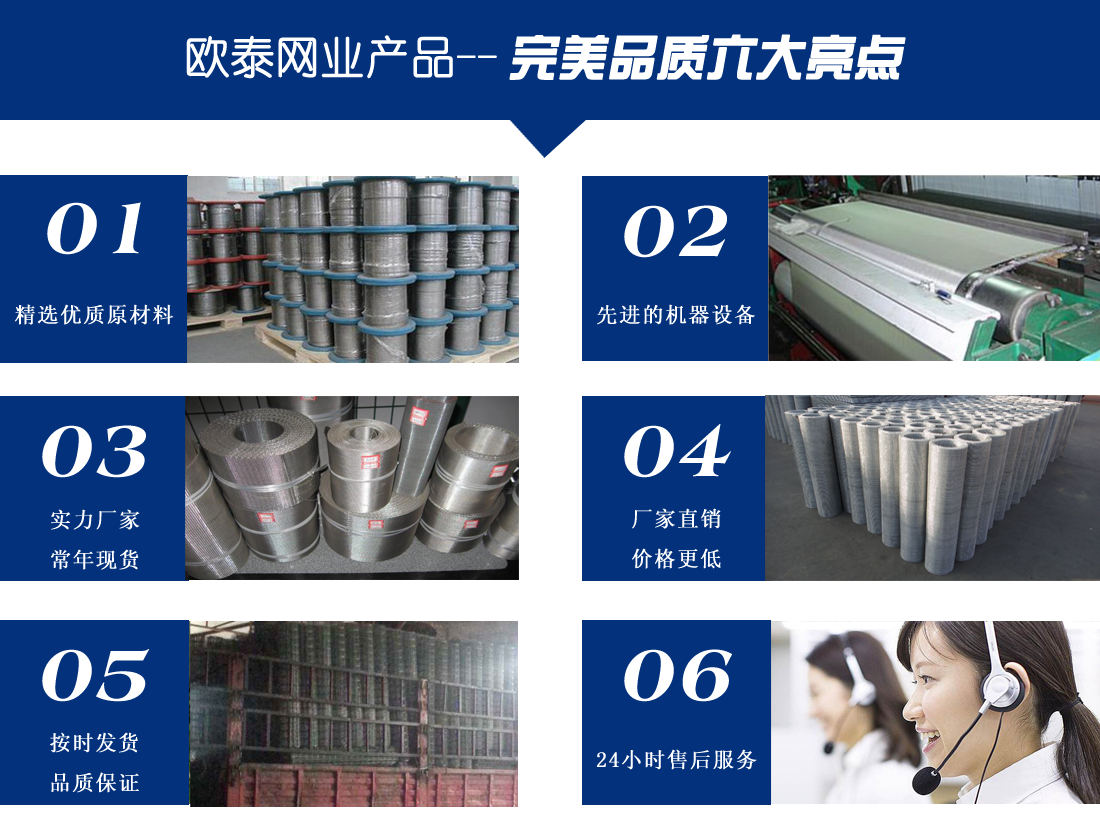 河北省安平縣歐泰五金網(wǎng)業(yè)有限公司座落于聞名全國的絲網(wǎng)之鄉(xiāng)河北省安平縣,是一家集科研,生產(chǎn), 經(jīng)營,銷售為一體的綜合性企業(yè)。我廠技術(shù)力量雄厚,采用優(yōu)質(zhì)原材料,嚴(yán)把質(zhì)量關(guān),主要絲網(wǎng)產(chǎn)品:編織系列:不銹鋼 絲網(wǎng),鐵絲網(wǎng),電鍍鋅鐵絲網(wǎng),熱鍍鋅鐵絲網(wǎng),包塑鐵絲網(wǎng),窗紗,,輸送網(wǎng),合股網(wǎng),勾花網(wǎng),六角網(wǎng),石籠網(wǎng),銀絲,銀網(wǎng)。護(hù) 欄網(wǎng):護(hù)攔網(wǎng)、公路護(hù)欄網(wǎng),鐵路護(hù)欄網(wǎng),機(jī)場護(hù)欄網(wǎng),工廠防護(hù)網(wǎng),小區(qū)防護(hù)網(wǎng),電焊網(wǎng),電焊網(wǎng)片,聚脂網(wǎng)系列:聚脂成型 網(wǎng)、聚脂單絲干網(wǎng)、印刷網(wǎng)。金屬板網(wǎng):鋼板網(wǎng)、鎳板網(wǎng),鋁板網(wǎng),沖孔網(wǎng)主要應(yīng)用于工業(yè),石油,化工,建筑,紡織,醫(yī) 藥,航天,航空,養(yǎng)殖,冶金機(jī)械等多個(gè)領(lǐng)域,我廠技術(shù)力量雄厚,設(shè)備先進(jìn),檢測方法齊全,產(chǎn)品質(zhì)量穩(wěn)定....